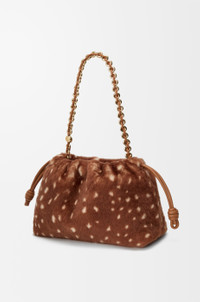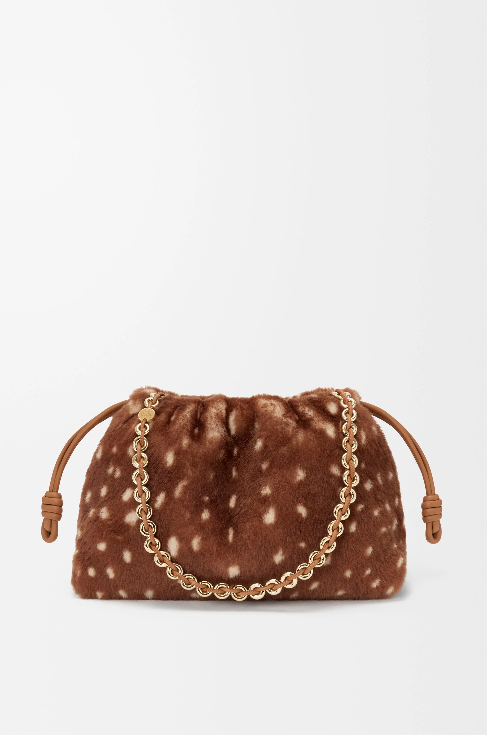 The Flamenco purse is a lightweight and soft bag with a ruched shape, historical knot drawstrings and a donut chain. This medium version is crafted in deer-print shearling. - Shoulder, crossbody or hand carry - Detachable donut chain with Anagram Pebble - Detachable and adjustable leather strap - Magnetic closure - Suede lining Colour: Brown/White Metallic colour: Gold Main material: Deer printed shearling Strap length: 59/ 82 -142 cm Strap drop: 27 / 37 - 67 cm Weight: 0.52 kg Height: 20 cm Width: 30 cm Depth: 10.5 cm Made in: Spain