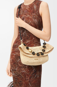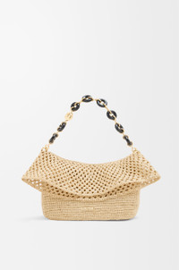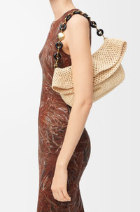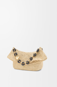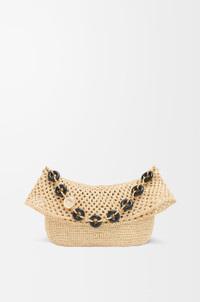 The Ola is a soft, lightweight and versatile summer bag defined by a curved body, a flowing flap and a statement donut chain. This medium version is crafted in raffia with calfskin details. - Detachable tubular calfskin strap, donut chain - Flap closure - One internal pocket - Metal LOEWE, engraved Anagram Colour: Natural Metallic colour: Gold Main material: Raffia/Calf Strap length: 37/97-61 cm Strap drop: 15/31-56 cm Weight: 0.56 kg Height: 18 cm Width: 26 cm Depth: 13 cm Made in: Spain