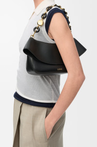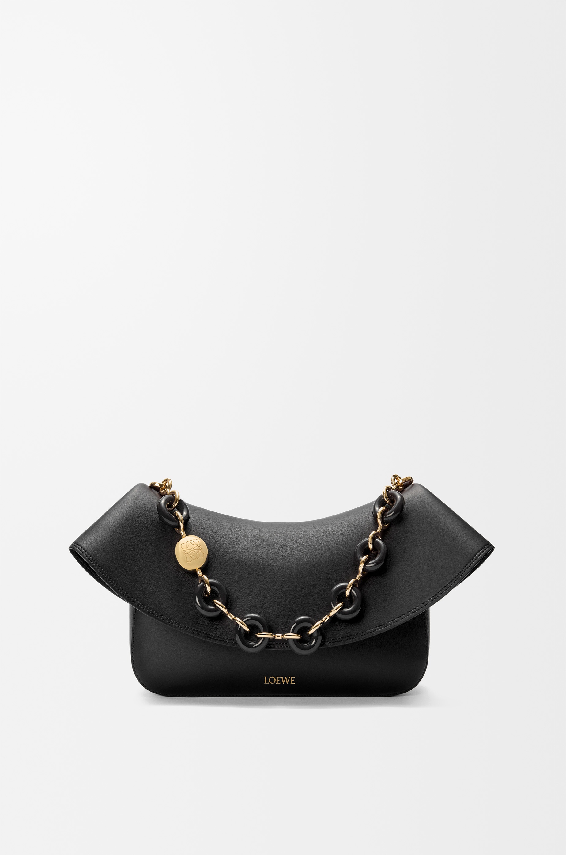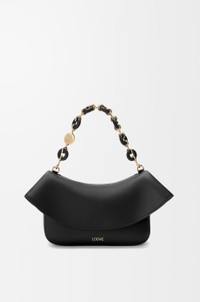 The Ola is a soft, lightweight and versatile summer bag defined by a curved body, a flowing flap and a statement donut chain. This medium version is crafted in smooth calfskin. - Detachable tubular calfskin strap, detachable donut chain - Flap closure - One internal pocket - Gold embossed LOEWE, engraved Anagram Colour: Black Metallic colour: Gold Main material: Smooth Calf Strap length: 37/97-61 cm Strap drop: 15/31-56 cm Weight: 0.53 kg Height: 18 cm Width: 26 cm Depth: 13 cm Made in: Spain