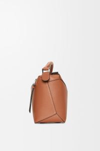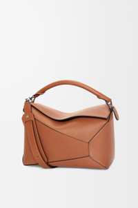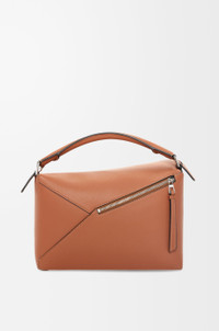 The Puzzle Edge is defined by its distinctive geometric lines and its cuboid form. It differs to the classic construction in its overlapped panels with single stitch lines. This medium version is crafted in classic calfskin. - Shoulder, crossbody or hand carry - Detachable and adjustable strap - Zip closure with calfskin pull - One external zip rear pocket, two internal slip pockets - Herringbone cotton canvas lining - Embossed Anagram Colour: Tan Metallic colour: Palladium Main material: Classic calf Strap length: 78-116 cm Strap drop: 36 - 55 cm Handle drop: 9 cm Weight: 0.78 kg Height: 19.5 cm Width: 29 cm Depth: 14 cm Made in: Spain