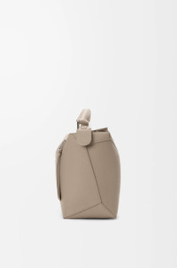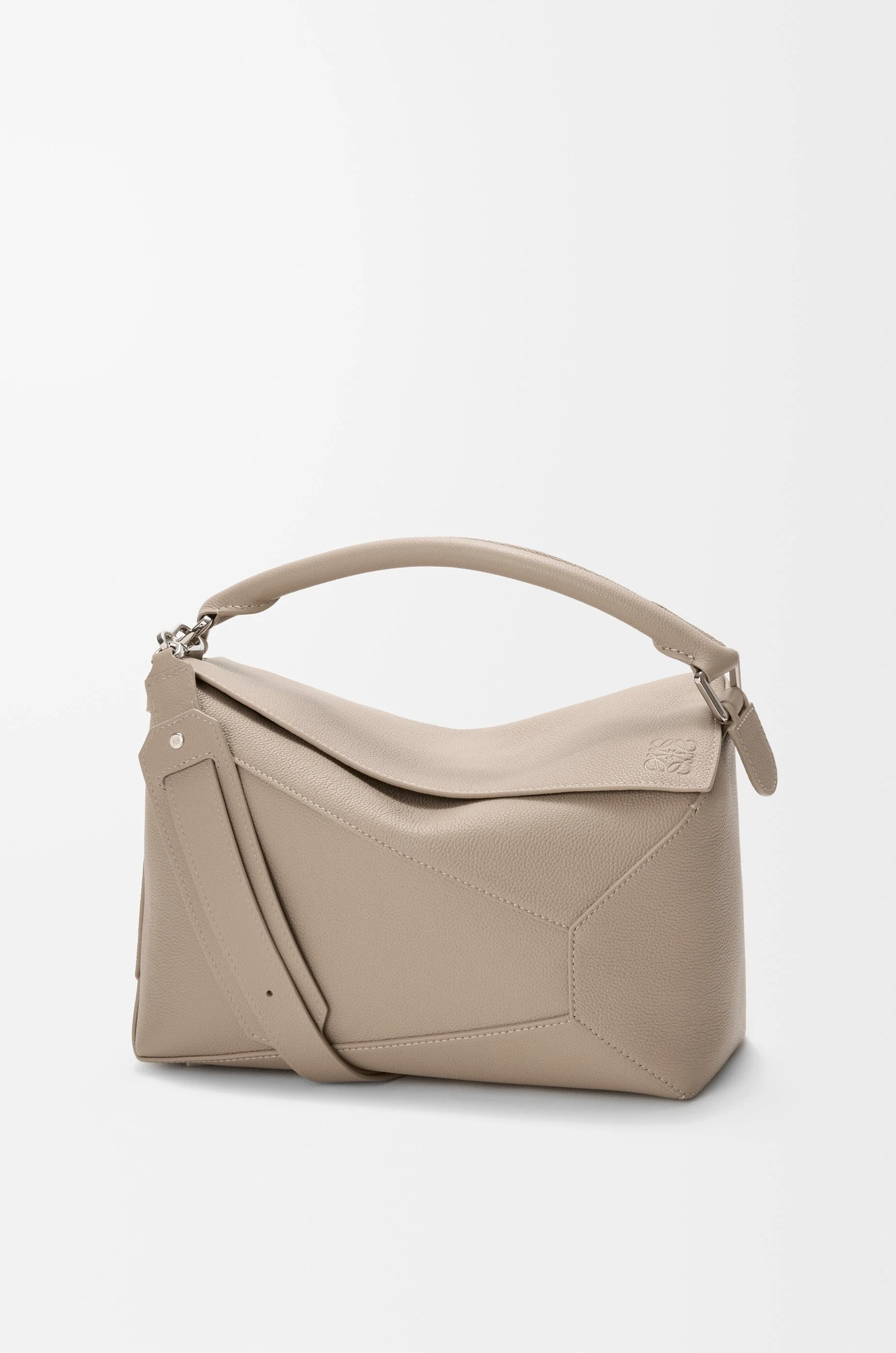 The Puzzle Edge is defined by its distinctive geometric lines and its cuboid form. It differs to the classic construction in its overlapped panels with single stitch lines. This medium version is crafted in soft grained calfskin. - Shoulder, crossbody or hand carry - Detachable and adjustable strap - Zip closure with calfskin pull - One external zip rear pocket, two internal slip pockets - Herringbone cotton canvas lining - Embossed Anagram Colour: Clay Metallic colour: Palladium Main material: Soft Grained Calf Strap length: 78-116 cm Strap drop: 36 - 55 cm Handle drop: 9 cm Weight: 0.68 kg Height: 19.5 cm Width: 29 cm Depth: 14 cm Made in: Spain