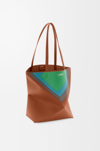 The Puzzle Fold's lightweight geometric structure is designed to fold completely flat, making it a perfect tote to travel with. This medium version is crafted in nappa calfskin with intarsio squares inspired by Josef Albers's "Homage to the Square" series. This bag is part of the LOEWE x Albers collection. - Shoulder or hand carry - Suede lining - Gold or silver embossed LOEWE, gold or silver embossed LOEWE and Josef Albers signature Colour: Caramel/Bright Green Main material: Nappa Calf Handle drop: 27 cm Weight: 0.462 kg Height: 31.5 cm Width: 25.5 cm Depth: 14.5 cm Made in: Spain