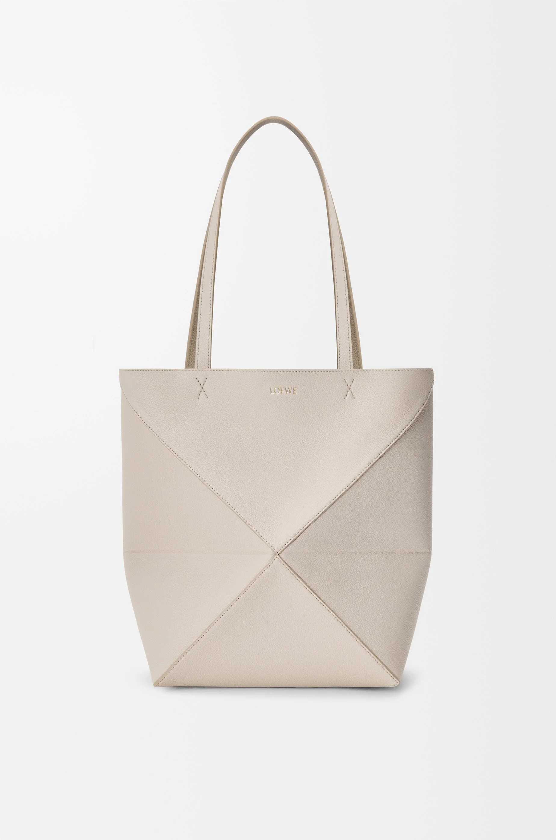 The Puzzle Fold's lightweight geometric structure is designed to fold completely flat, making it a perfect tote to travel with. This medium version is crafted in newly-offered soft grained calfskin. - Shoulder or hand carry - Suede lining - Gold embossed LOEWE Colour: Light Ghost Main material: Soft Grained Calf Handle drop: 27 cm Weight: 0.461 kg Height: 31.5 cm Width: 25.5 cm Depth: 14.5 cm Made in: Spain