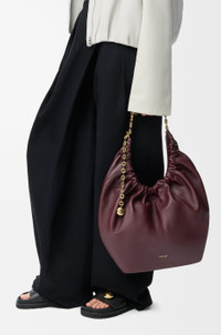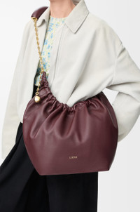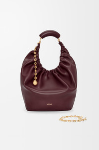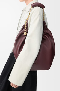 The Squeeze bag is a sophisticated and feminine bag in buttery nappa leather. It is a masterpiece of traditional craftsmanship, innovative research and distinctive design, with a surprisingly light ruched body, an adjustable donut chain and a tactile squeezy handle. This is a medium version in nappa lambskin. - Shoulder, crossbody or hand carry - Adjustable chain strap with Anagram engraved pebble and additional chain to extend the strap further - Magnetic closure - Internal zipped pocket - Unlined - Gold or silver LOEWE embossed Details - Colour: Dark Burgundy - Metallic colour: Gold - Main material: Mellow Nappa Lambskin - Strap length: 45 - 81 cm - Handle drop: 24 - 42 cm - Weight: 0.72 kg - Height (cm): 33 - Width (cm): 34 - Depth (cm): 13.5 - Height (inch): 13 - Width (inch): 13.4 - Depth (inch): 5.3 - Model ID: A914Q37X01 - CIL: 0011036381 - Made in: Spain