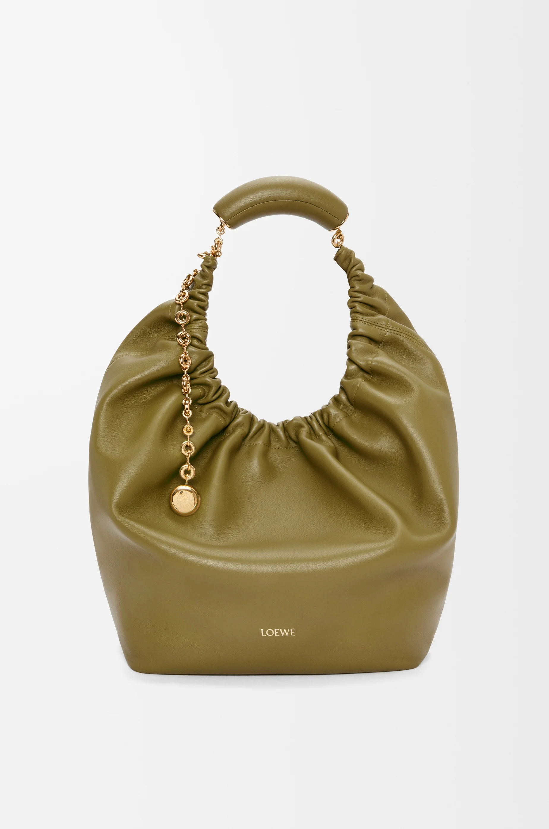 The Squeeze bag is a sophisticated and feminine bag in buttery nappa leather. It is a masterpiece of traditional craftsmanship, innovative research and distinctive design, with a surprisingly light ruched body, an adjustable donut chain and a tactile squeezy handle. This is a medium version in nappa lambskin. - Shoulder, crossbody or hand carry - Adjustable chain strap with Anagram engraved pebble and additional chain to extend the strap further - Magnetic closure - Internal zipped pocket - Unlined - Gold embossed LOEWE Details - Colour: Olive - Metallic colour: Gold - Main material: Mellow Nappa Lambskin - Strap length: 45 - 81 cm - Handle drop: 24 - 42 cm - Weight: 0.72 kg - Height (cm): 33 - Width (cm): 34 - Depth (cm): 13.5 - Height (inch): 13 - Width (inch): 13.4 - Depth (inch): 5.3 - Model ID: A914Q37X01 - CIL: 0010947554 - Made in: Spain
