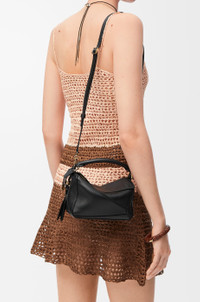 The Featherlight Puzzle is defined by its distinctive geometric lines and its cuboid form. The supple featherlight nappa makes the bag soft and slouchy. - Shoulder, crossbody or hand carry - Detachable and adjustable strap with rotating dogclips, top handle - Zip closure with articulated pull - Detachable LOEWE gold or silver embossed tag with secret pocket and balloon dice - Baguette-shaped metal feet - Nappa lambskin lining - Embossed Anagram, LOEWE engraved internal plaque Colour: Black Metallic colour: Gold Main material: Featherlight Nappa Lambskin Strap length: 91 - 111 cm Strap drop: 58 cm Handle drop: 4 cm Weight: 0.28 kg Height: 12.5 cm Width: 17.5 cm Depth: 7.5 cm Made in: Spain