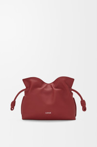 The Flamenco clutch is a soft and slouchy bag with a cinched closure and historical knot drawstrings. This mini version is crafted in nappa calfskin. - Shoulder, crossbody or hand carry - Detachable and adjustable strap - Magnetic closure - Suede lining - Gold or silver embossed LOEWE Colour: Burnt Red Metallic colour: Palladium Main material: Nappa calf Strap length: 96-120 cm Strap drop: 36 - 49 cm Weight: 0.3 kg Height: 18 cm Width: 23.9 cm Depth: 9 cm Made in: Spain