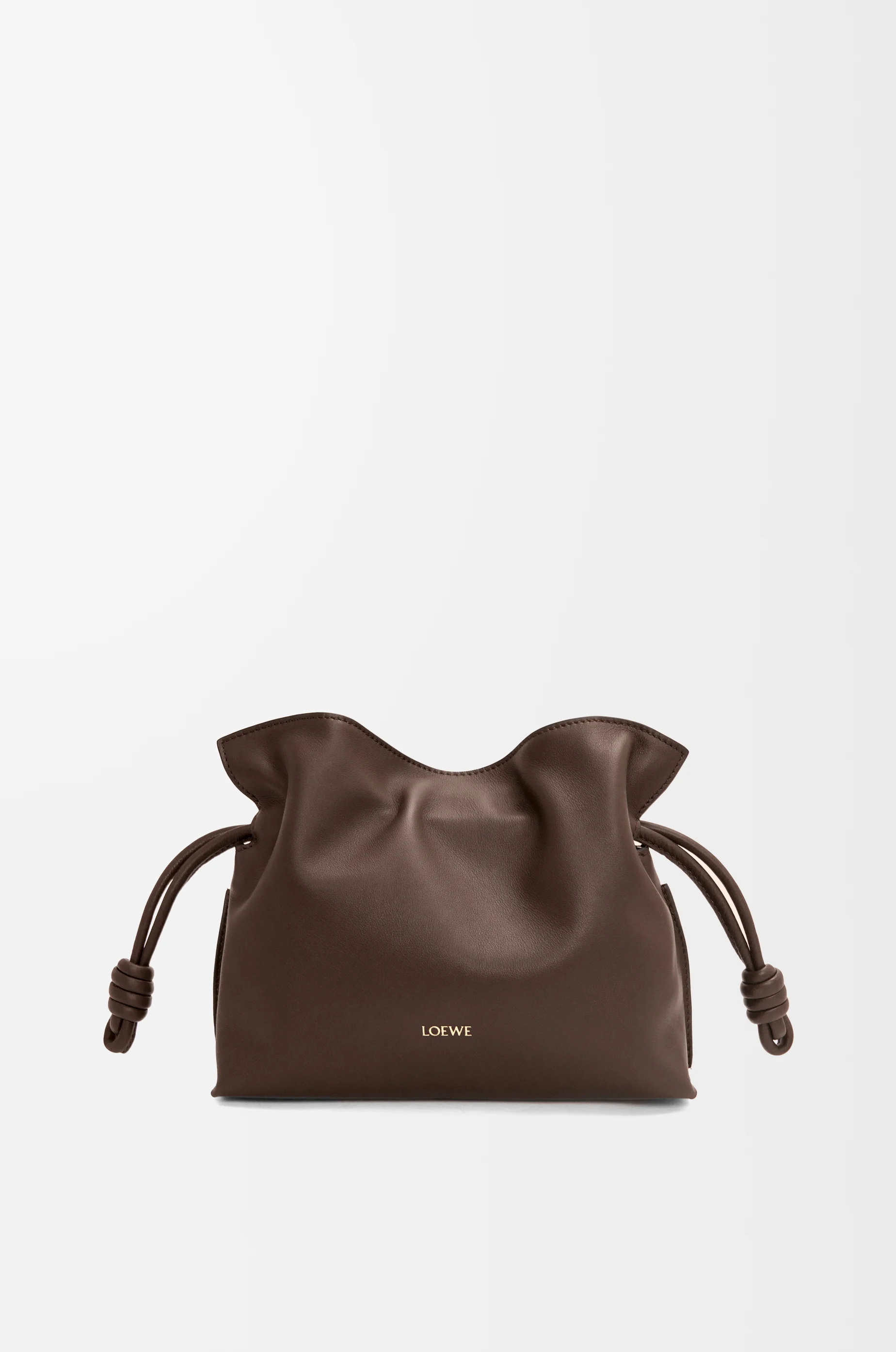 Launched in the 1980s, the Flamenco Clutch cinches closed using drawstring pulls finished in signature coiled knots. This mini version is crafted in nappa calfskin. - Shoulder, crossbody or hand carry - Detachable and adjustable strap - Discreet magnetic closure - Gold suede lining - Gold or silver LOEWE embossed Details - Colour: Chocolate - Metallic colour: Gold - Main material: Nappa Calf - Strap length: 96 - 120 cm - Weight: 0.3 kg - Height (cm): 18 - Width (cm): 23.9 - Depth (cm): 9 - Height (inch): 7.1 - Width (inch): 9.4 - Depth (inch): 3.5 - Model ID: A411FC2X73 - CIL: 0010966026 - Made in: Spain