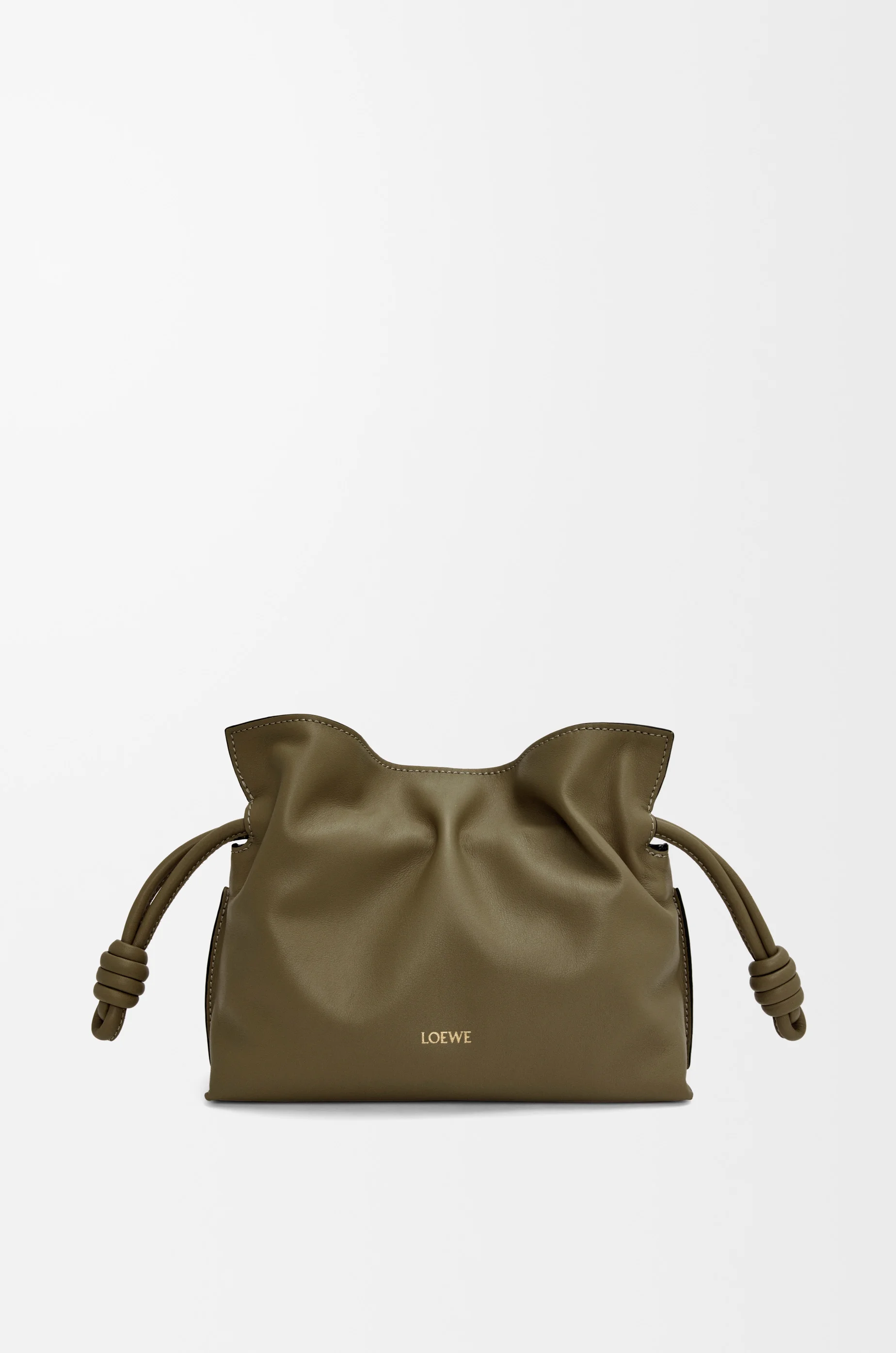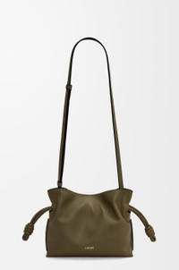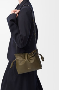 Launched in the 1980s, the Flamenco Clutch cinches closed using drawstring pulls finished in signature coiled knots. This mini version is crafted in nappa calfskin. - Shoulder, crossbody or hand carry - Detachable and adjustable strap - Discreet magnetic closure - Gold suede lining - Gold or silver LOEWE embossed Details - Colour: Dark Khaki Green - Metallic colour: Gold - Main material: Nappa Calf - Strap length: 96 - 120 cm - Weight: 0.3 kg - Height (cm): 18 - Width (cm): 23.9 - Depth (cm): 9 - Height (inch): 7.1 - Width (inch): 9.4 - Depth (inch): 3.5 - Model ID: A411FC2X73 - CIL: 0010965994 - Made in: Spain