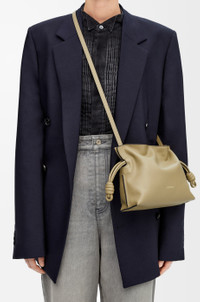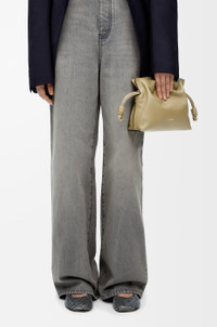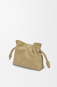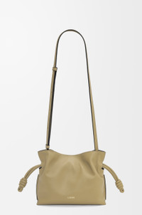 Launched in the 1980s, the Flamenco Clutch cinches closed using drawstring pulls finished in signature coiled knots. This mini version is crafted in nappa calfskin. - Shoulder, crossbody or hand carry - Detachable and adjustable strap - Discreet magnetic closure - Gold suede lining - Gold or silver LOEWE embossed Details - Colour: Clay Green - Metallic colour: Gold - Main material: Nappa Calf - Strap length: 96 - 120 cm - Weight: 0.3 kg - Height (cm): 18 - Width (cm): 23.9 - Depth (cm): 9 - Height (inch): 7.1 - Width (inch): 9.4 - Depth (inch): 3.5 - Model ID: A411FC2X73 - CIL: 0010965986 - Made in: Spain
