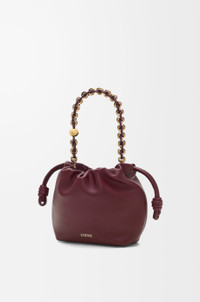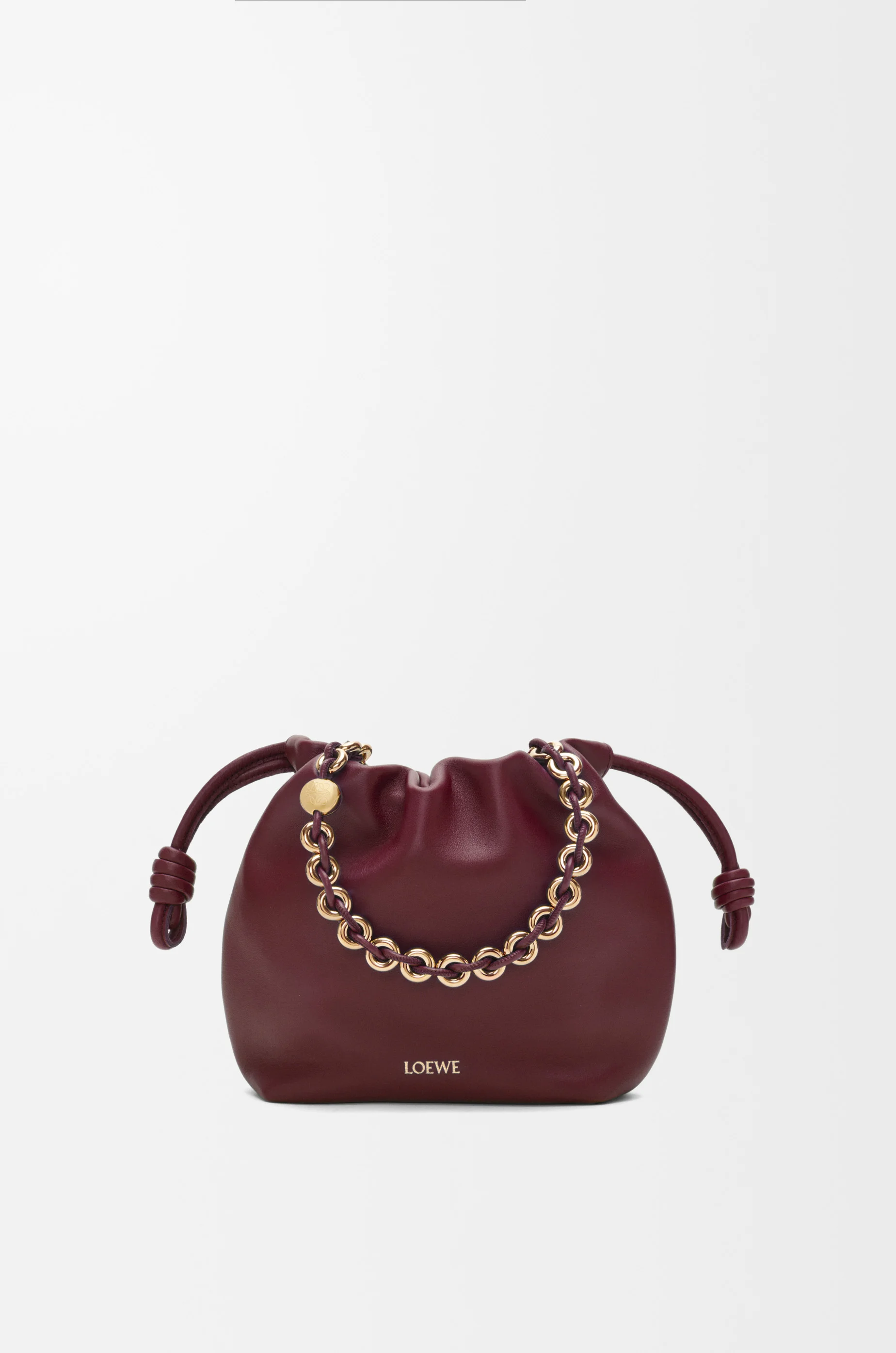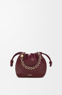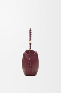 The sensual and mellow Flamenco Purse is defined by a ruched design complemented by key details such as the signature knots at the sides. Versatile and functional, it can be carried as a clutch, worn over the shoulder using the donut chain or crossbody with the accompanying leather strap. This version is crafted in mellow nappa lambskin. - Shoulder, crossbody or hand carry - Detachable and adjustable leather strap - Detachable donut chain adorned with Anagram engraved Pebble - Discreet magnetic closure - Suede lining - Gold or silver embossed LOEWE Details - Colour: Dark Burgundy - Metallic colour: Gold - Main material: Mellow Nappa Lambskin - Weight: 0.18 kg - Height (cm): 17 - Width (cm): 23 - Depth (cm): 5.5 - Height (inch): 6.7 - Width (inch): 9.1 - Depth (inch): 2.2 - Model ID: A914CBPX03 - CIL: 0010976835 - Made in: Spain