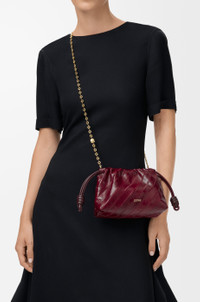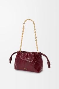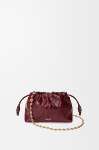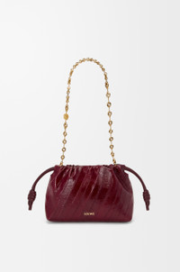 The Flamenco purse is a lightweight and soft bag with a ruched shape and historical knot drawstrings. This mini version is crafted in eel, arranged in a distinctive diagonal pattern, with a mini donut chain that can be doubled over thanks to an inside D-ring. - Shoulder, crossbody or hand carry - Detachable sliding donut chain with Anagram Pebble - Magnetic closure - Nappa lambskin lining - Gold embossed LOEWE Colour: Burgundy Metallic colour: Gold Main material: Eel Strap length: 112 cm Strap drop: 52 cm Weight: 0.252 kg Height: 14 cm Width: 21 cm Depth: 8 cm Made in: Spain
