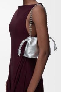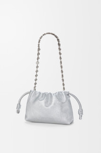 The Flamenco purse is a lightweight and soft bag with a ruched shape and historical knot drawstrings. This mini version is crafted in moire printed calfskin, with a mini donut chain that can be doubled over thanks to an inside D-ring. - Shoulder, crossbody or hand carry - Detachable sliding donut chain with Anagram Pebble - Magnetic closure - Suede lining - Embossed LOEWE Colour: Silver Metallic colour: Palladium Main material: Moire printed calf Strap length: 112 cm Strap drop: 52 cm Weight: 0.26 kg Height: 14 cm Width: 21 cm Depth: 8 cm Made in: Spain