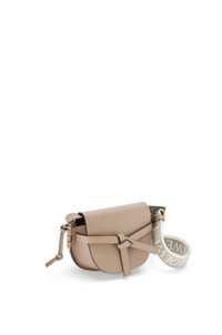 The Mini Gate Dual displays LOEWE's unrivalled leather craftsmanship with a saddle-stitched knotted leather strap and a side-latched metal pin that gives the bag its name. This mini version is crafted in soft calfskin and features a removable shoulder strap in calfskin and jacquard with a repeat LOEWE pattern. - Shoulder, crossbody, sling or belt carry - Detachable and adjustable shoulder strap - Front flap pulls in under knotted belt for secure fastening - Two internal slip pockets - Customisable with personalisation charms - Gold suede lining - Embossed Anagram Details - Colour: Sand - Metallic colour: Gold - Main material: Soft Calf/Jacquard - Strap length: 84 - 126 cm - Weight: 0.36 kg - Height (cm): 12.5 - Width (cm): 21 - Depth (cm): 9.5 - Height (inch): 4.9 - Width (inch): 8.3 - Depth (inch): 3.7 - Model ID: A650N46X13 - CIL: 0010643419 - Made in: Spain