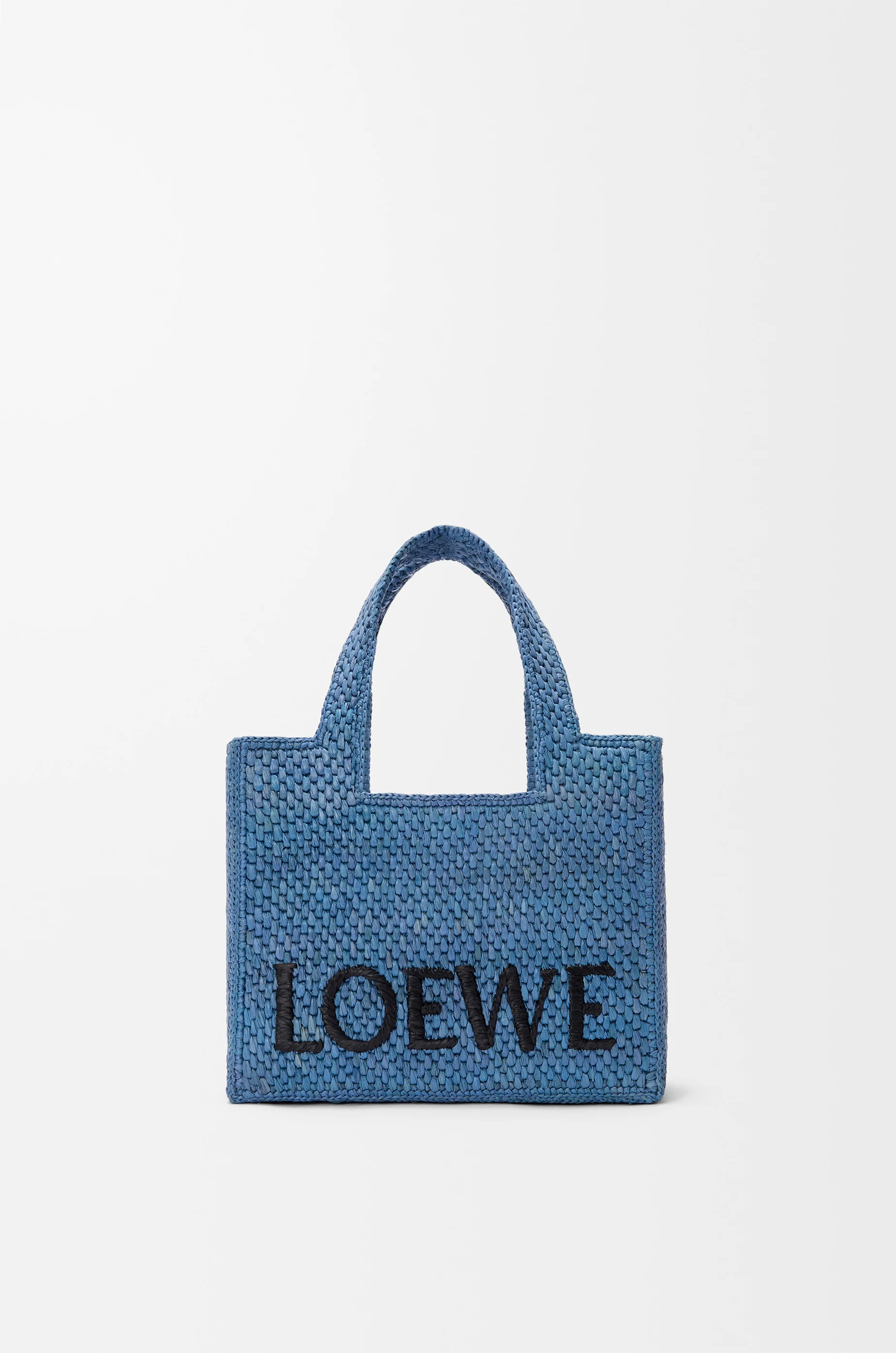 The LOEWE Font tote is a cuboid bag with a contrasting LOEWE signature. It is made in Spain using raffia palm leaves cultivated and handwoven by artisans in Madagascar. - Shoulder, crossbody or hand carry - Detachable and adjustable strap - Unlined Colour: Light Blue Metallic colour: Palladium Main material: Raffia Strap length: 107 - 117 cm Strap drop: 50 - 55 cm Handle drop: 13 cm Weight: 0.29 kg Height: 16 cm Width: 19 cm Depth: 6.5 cm