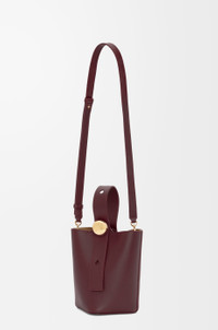 A novel and innovative bag silhouette, the Pebble combines pure minimalistic lines with a strong design statement. At once ornamental and functional, the signature Anagram-engraved hardware allows to adjust strap length and suit a number of carry styles. The distinctive twisted construction is complemented by subtle elevated details. This mini version is crafted in mellow calfskin. - Crossbody, shoulder or hand carry - Adjustable and removable strap - Magnetic closure - Internal pocket - Bonded suede lining - Anagram engraved Pebble Details - Colour: Dark Burgundy - Metallic colour: Gold - Main material: Mellow Calf - Strap length: 96 - 119 cm - Handle drop: 7 - 15 cm - Weight: 0.34 kg - Height (cm): 19.5 - Width (cm): 16 - Depth (cm): 16 - Height (inch): 7.7 - Width (inch): 6.3 - Depth (inch): 6.3 - Model ID: AANBBBMX01 - CIL: 0010974582 - Made in: Spain