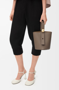 The Pebble is a minimalistic bucket bag with a wide strap adjustable through an oversized Pebble closure. This mini version is crafted in soft grained calfskin. - Crossbody, shoulder or hand carry - Additional adjustable and removable strap - One internal pocket - Suede lining - Anagram Pebble Colour: Taupe Metallic colour: Gold Main material: Soft Grained Calf Strap length: 96 - 119 cm Strap drop: 45 - 57 cm Handle drop: 7 - 15 cm Weight: 0.38 kg Height: 19.5 cm Width: 16 cm Depth: 16 cm Made in: Spain