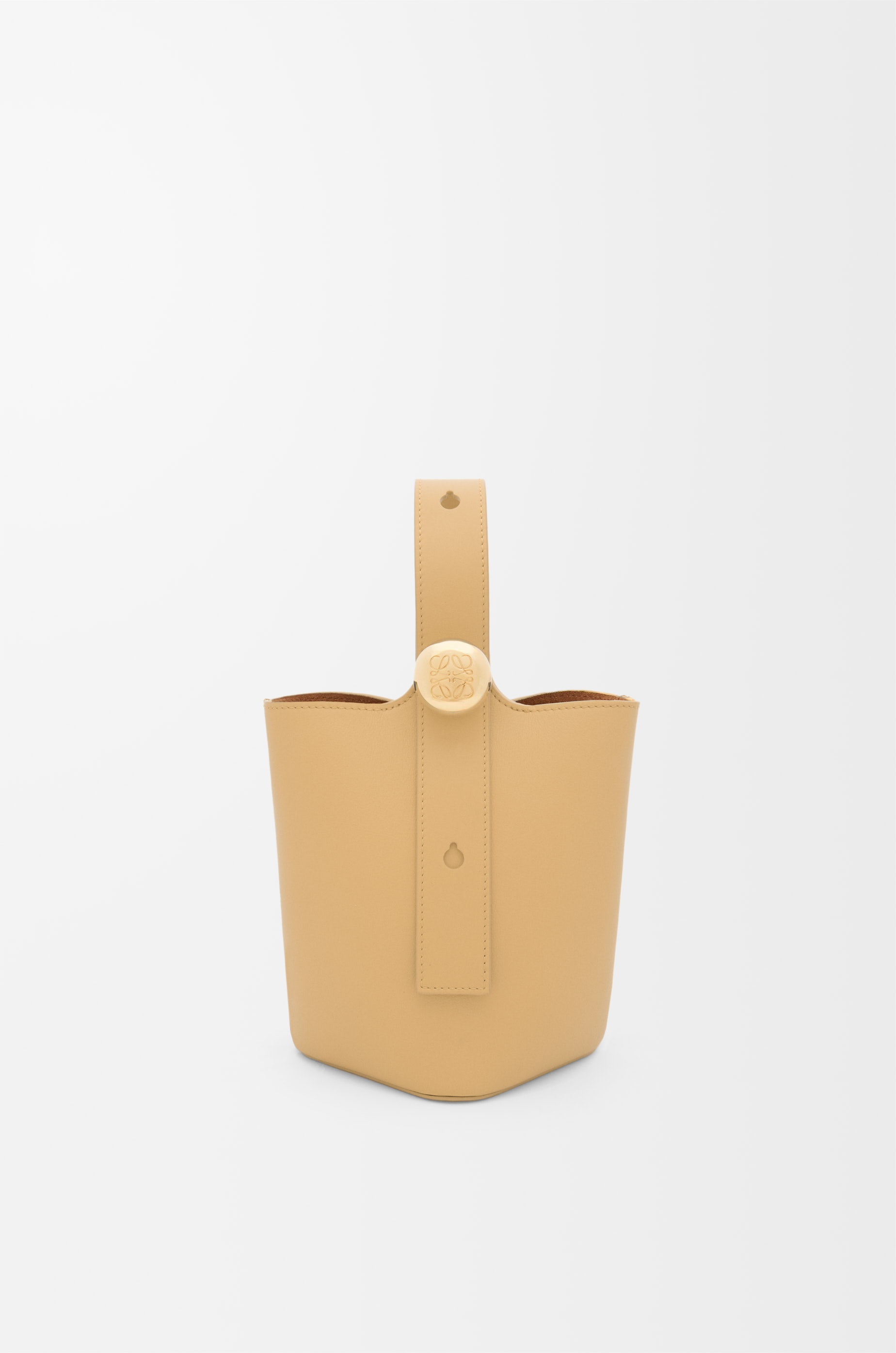 The Pebble is a minimalistic bucket bag with a wide strap adjustable through an oversized Pebble closure. This mini version is crafted in smooth calfskin. - Crossbody, shoulder or hand carry - Additional detachable and adjustable strap - Magnetic closure - One internal pocket - Suede lining - Engraved Anagram Colour: Dark Butter Metallic colour: Gold Main material: Smooth Calf Strap length: 96 - 119 cm Strap drop: 45 - 57 cm Handle drop: 7 - 15 cm Weight: 0.34 kg Height: 19.5 cm Width: 16 cm Depth: 16 cm Made in: Spain