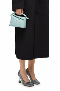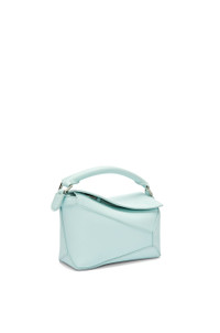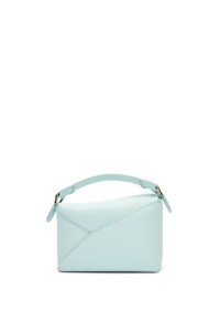 The Puzzle bag is the debut bag for LOEWE by Creative Director Jonathan Anderson. A cuboid shape and precise cutting technique create Puzzle’s distinctive geometric lines. This mini version is crafted in classic calfskin. - Shoulder, crossbody, top handle or clutch carry - Removable and adjustable shoulder strap - Zip closure with calfskin pull - Customisable with strap and personalisation charms - Herringbone cotton canvas lining - Embossed Anagram Details - Colour: Blue Iceberg - Metallic colour: Palladium - Main material: Classic Calf - Strap length: 108.5 - 137 cm - Handle drop: 4 cm - Weight: 0.24 kg - Height (cm): 12.5 - Width (cm): 18 - Depth (cm): 8 - Height (inch): 4.9 - Width (inch): 7.1 - Depth (inch): 3.1 - Model ID: A510P88X26 - CIL: 0010965507 - Made in: Spain