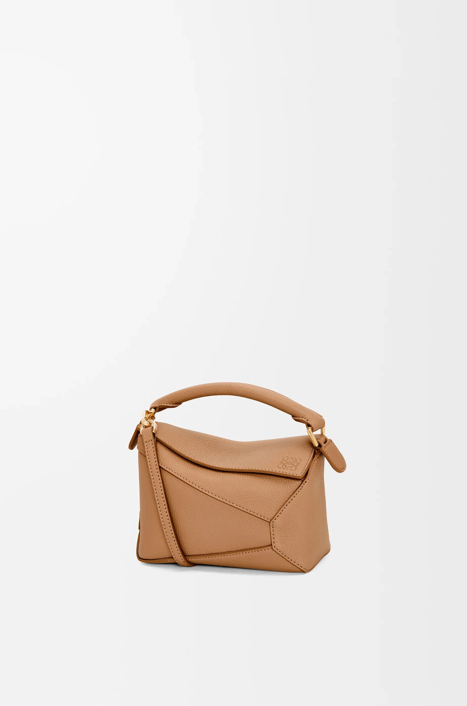 The Puzzle bag is the debut bag for LOEWE by Creative Director Jonathan Anderson. A cuboid shape and precise cutting technique create Puzzle’s distinctive geometric lines. This mini version is crafted in soft grained calfskin with overlapped edges. - The mini Puzzle can hold for example a small vertical wallet, most mobile phones (up to 6.1 inches) and sunglasses case. - Shoulder, crossbody, top handle or clutch carry - Removable shoulder strap - Zip closure with calfskin pull - Customisable with strap and personalisation charms - Herringbone cotton canvas lining - Embossed Anagram Details - Colour: Toffee - Metallic colour: Gold - Main material: Soft Grained Calf - Strap length: 108.5 - 137 cm - Handle drop: 4 cm - Weight: 0.27 kg - Height (cm): 12.5 - Width (cm): 18 - Depth (cm): 8 - Height (inch): 4.9 - Width (inch): 7.1 - Depth (inch): 3.1 - Model ID: A510P88X16 - CIL: 0010896652 - Made in: Spain