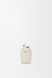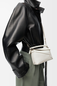 The Puzzle bag is the debut bag for LOEWE by Creative Director Jonathan Anderson. A cuboid shape and precise cutting technique create Puzzle’s distinctive geometric lines. This mini version is crafted in soft grained calfskin with overlapped edges. - The mini Puzzle can hold for example a small vertical wallet, most mobile phones (up to 6.1 inches) and sunglasses case. - Shoulder, crossbody, top handle or clutch carry - Removable shoulder strap - Zip closure with calfskin pull - Customisable with strap and personalisation charms - Herringbone cotton canvas lining - Embossed Anagram Details - Colour: Soft White - Metallic colour: Palladium - Main material: Soft Grained Calf - Strap length: 108.5 - 137 cm - Handle drop: 4 cm - Weight: 0.27 kg - Height (cm): 12.5 - Width (cm): 18 - Depth (cm): 8 - Height (inch): 4.9 - Width (inch): 7.1 - Depth (inch): 3.1 - Model ID: A510P88X16 - CIL: 0010896660 - Made in: Spain
