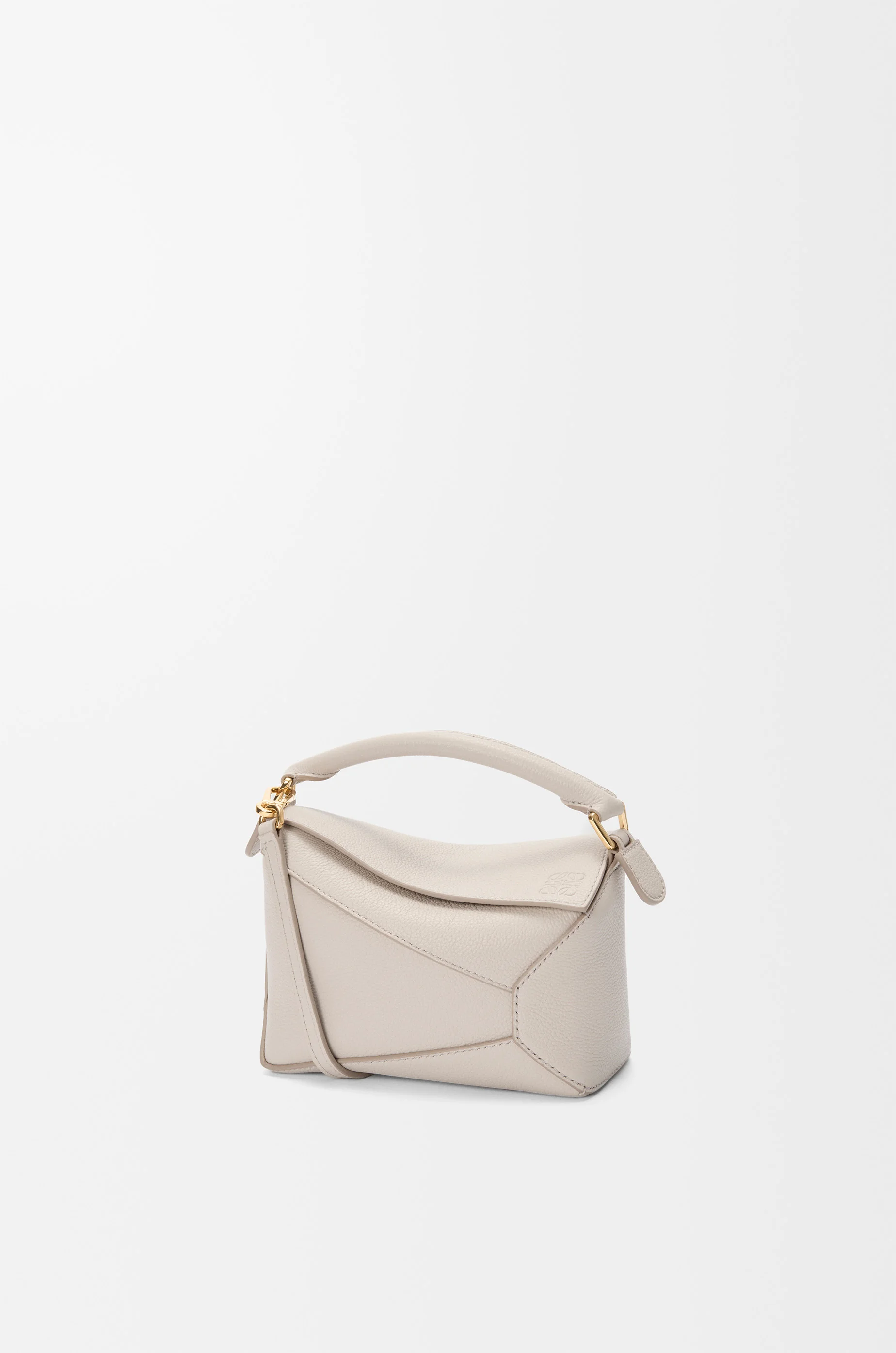 The Puzzle Edge is defined by its distinctive geometric lines and its cuboid form. It differs to the classic construction in its overlapped panels with single stitch lines. This mini version is crafted in soft grained calfskin. - Shoulder, crossbody or hand carry - Detachable and adjustable strap - Zip closure with calfskin pull - Herringbone cotton canvas lining - Embossed Anagram Colour: Light Ghost Metallic colour: Gold Main material: Soft Grained Calf Strap length: 108.5 - 137 cm Strap drop: 54.5 - 68.5 cm Handle drop: 4 cm Weight: 0.27 kg Height: 12.5 cm Width: 18 cm Depth: 8 cm Made in: Spain