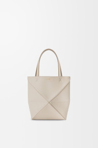 The Puzzle Fold's lightweight geometric structure is designed to fold completely flat, making it a perfect tote to travel with. This mini version is crafted in newly-offered soft grained calfskin. - Shoulder, crossbody or hand carry - Detachable and adjustable strap - Suede lining - Gold embossed LOEWE Colour: Light Ghost Metallic colour: Gold Main material: Soft Grained Calf Strap length: 99-114 cm Strap drop: 48 - 55 cm Handle drop: 14 cm Weight: 0.1765 kg Height: 20 cm Width: 16.5 cm Depth: 9.5 cm Made in: Spain