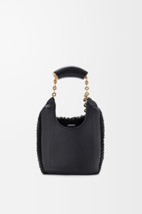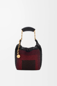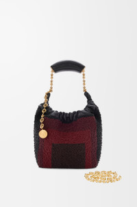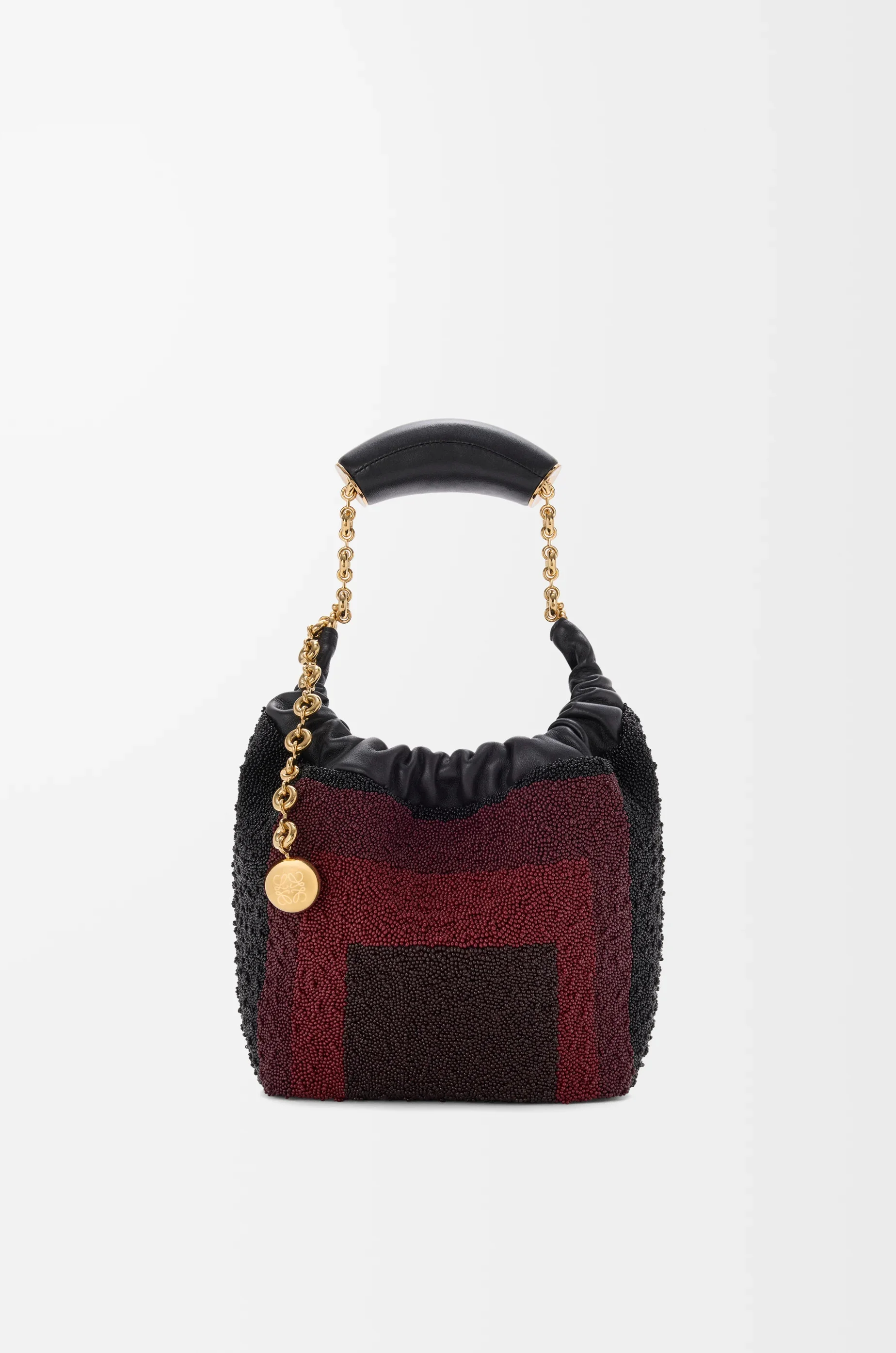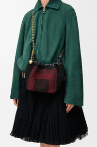 The Squeeze is a versatile design defined by a ruched body, a squeezy handle and a donut chain. This mini version is crafted in leather entirely hand-embroidered with glass beads featuring squares inspired by Josef Albers's "Homage to the Square" series. This bag is part of the LOEWE x Albers collection. - Shoulder, crossbody or hand carry - Adjustable chain strap with Anagram Pebble and additional chain to extend the strap further - Magnetic closure - Internal slip pocket - Nappa lambskin lining - Gold or silver embossed LOEWE and Josef Albers signature Colour: Black/Burgundy Metallic colour: Gold Main material: Embroidered Nappa Strap length: 13 - 96 cm Strap drop: 12 - 51 cm Weight: 0.71 kg Height: 17 cm Width: 18 cm Depth: 11 cm Made in: Spain