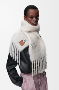 Scarf in medium-weight mohair and wool blend featuring an embroidered Futurist cat and lettering at the back. This scarf is inspired by Louis Wain's "Futurist Cats" porcelain vase series. - 23cm x 185cm - Fringed edges - LOEWE embossed leather patch placed on the corner Colour: White Main material: Mohair/wool/polyamide Weight: 0.203 kg Made in: Spain