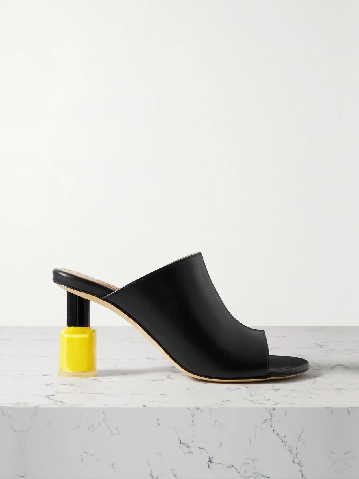 If you're trying to inject a little more fun into your wardrobe, Loewe's shoe collections won't let you down. Set on heels shaped like yellow nail polish bottles - which you could match your mani or pedi to - these mules are made from soft black leather.