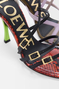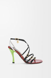 Sandal in mixed leather featuring an asymmetric design with a strappy upper and gold Pebble hardware. - 90mm Comic heel - Adjustable square buckle - Engraved Anagram on Pebble - Leather outsole Colour: Multicolor Main material: Mixed Leather Weight: 0.4 kg Made in: Italy