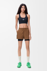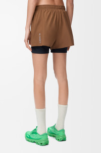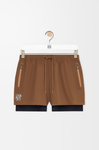 Shorts in lightweight technical shell featuring a double layer construction with built-in compression tights. - Regular fit, short length - Mid waist - Elasticated waist with drawstring - Waterproof zipped jet pockets - Reflective Anagram placed at the front - Reflective LOEWE x ON logo placed at the back Colour: Toffee Main material: Polyester Weight: 0.2 kg Materials & care Main Material: 100% polyester