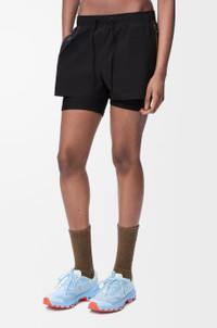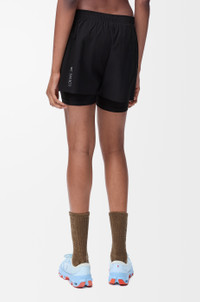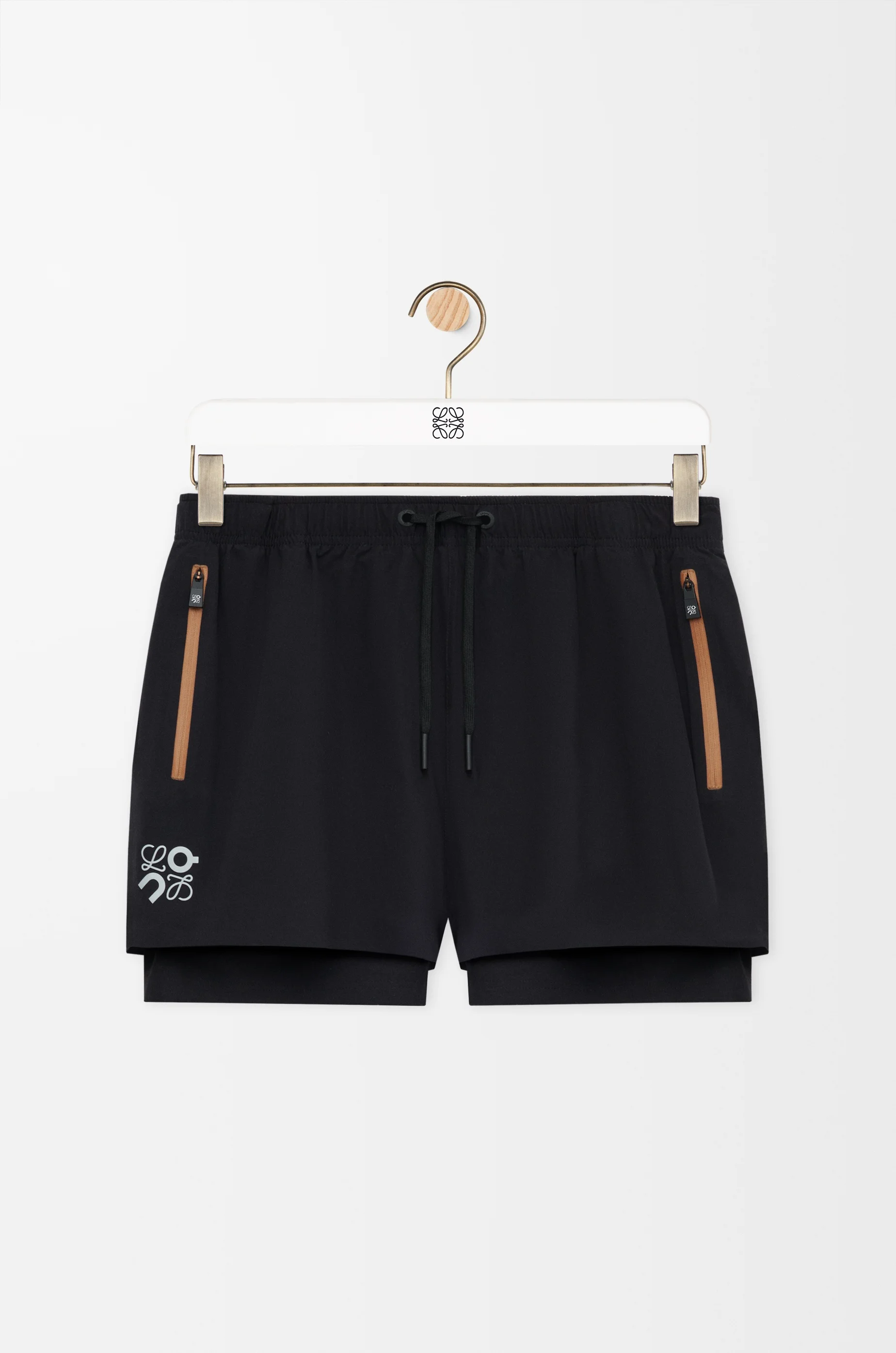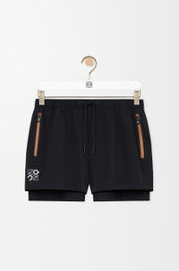 Shorts in lightweight technical shell featuring a double layer construction with built-in compression tights. - Regular fit, short length - Mid waist - Elasticated waist with drawstring - Waterproof zipped jet pockets - Reflective Anagram placed at the front - Reflective LOEWE x ON logo placed at the back Colour: Black Main material: Polyester Weight: 0.2 kg Materials & care Main Material: 100% polyester