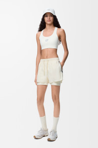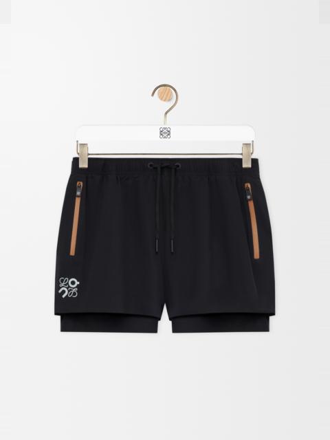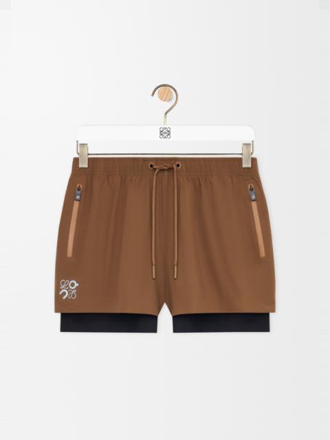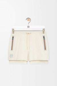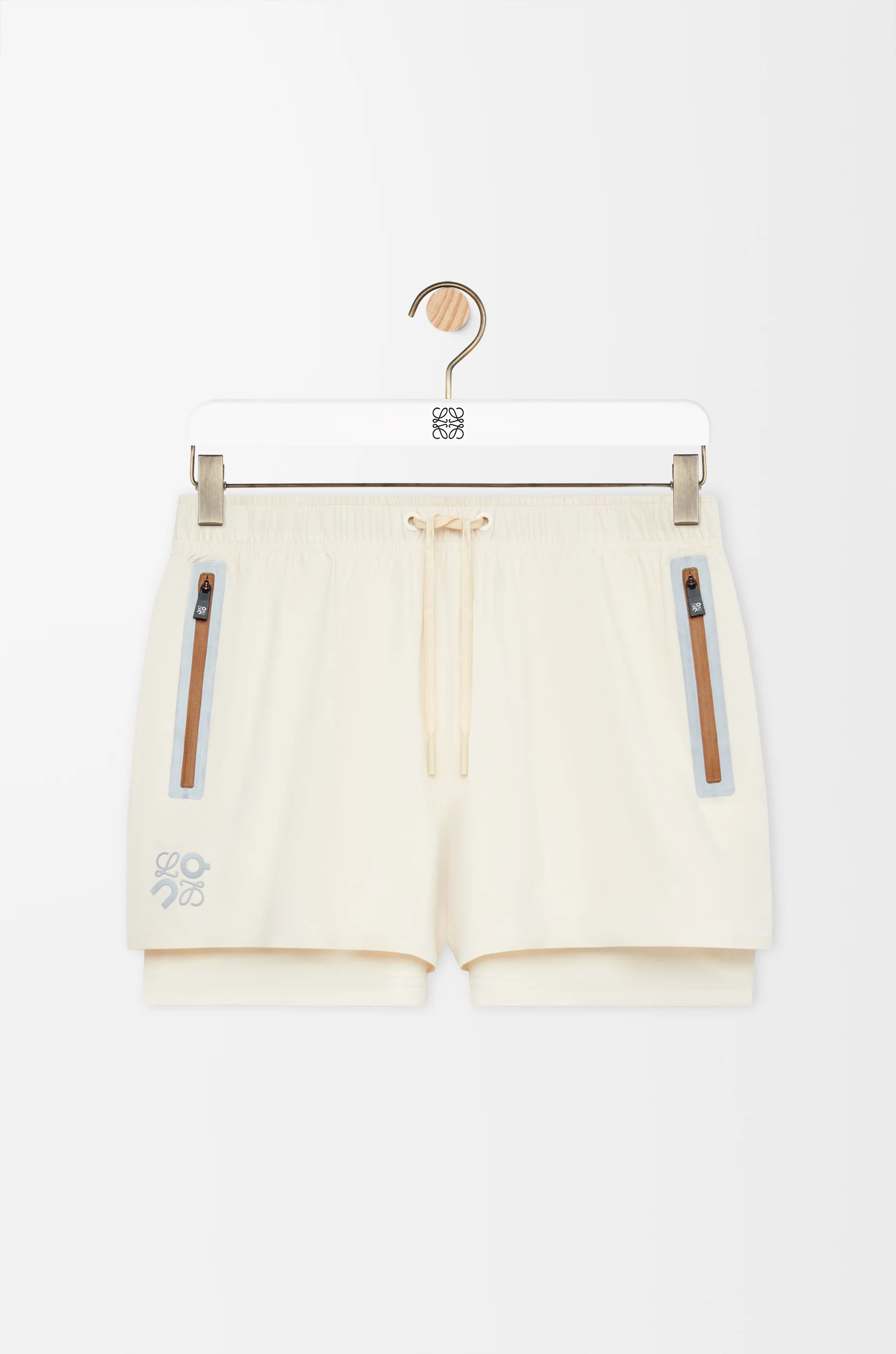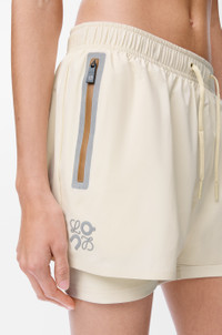 Shorts in lightweight technical shell featuring a double layer construction with built-in compression tights. - Regular fit, short length - Mid waist - Elasticated waist with drawstring - Waterproof zipped jet pockets - Reflective Anagram placed at the front - Reflective LOEWE x ON logo placed at the back Colour: Ivory Main material: Polyester Weight: 0.2 kg Materials & care Main Material: 100% polyester