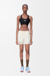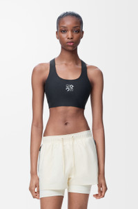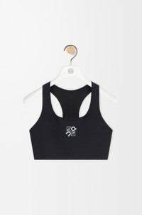Bra in lightweight sculping stretch 3D technical jersey featuring a scoop neck with a racerback and a spacer and underband for coverage and support. - Slim fit, cropped length - Elasticated hem - Bonded seams and flatlock stitching - Reflective Anagram placed at the front - Reflective LOEWE ON logo placed at the back Colour: Black Main material: Polyester/Elastane Weight: 0.1 kg Materials & care Main Material: 72% polyester 28% elastane