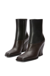 Bootie in two-tone calfskin featuring an asymmetric wavy toe shape and the Onda chunky heel. - 90mm heel - Internal zip - Leather insole and outsole Details - Colour : Black/Dark Brown - Main material : Calf - Heel height : 9 - Weight : 0.958 kg - Model ID : L814286X26 - Made in : Italy