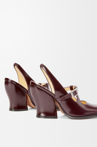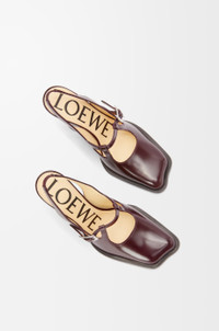 Slingback pump in brushed calfskin featuring an asymmetric wavy toe shape and the Onda chunky heel. - 90mm heel - LOEWE engraved adjustable buckle - Leather insole and outsole Details - Colour : Burgundy - Main material : Brushed Calf - Heel height : 9 - Weight : 0.672 kg - Model ID : L814462X03 - Made in : Italy