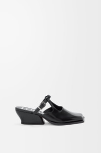 Mule in brushed calfskin featuring an asymmetric wavy toe shape and the Onda chunky heel. - 45mm heel - LOEWE engraved adjustable buckle - Leather insole and outsole Colour: Black Main material: Brushed Calf Weight: 0.65 kg Made in: Italy