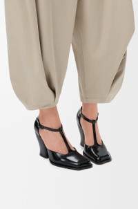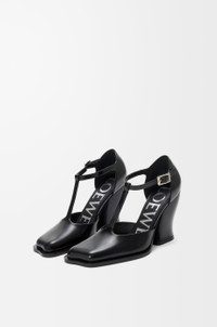 T-bar pump in brushed calfskin featuring an asymmetric wavy toe shape and the Onda chunky heel. - 90mm heel - LOEWE engraved adjustable buckle - Leather insole and outsole Colour: Black Main material: Brushed Calf Weight: 0.7 kg Made in: Italy