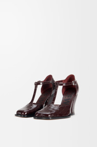 T-bar pump in crocodile-embossed calfskin featuring an asymmetric wavy toe shape and the Onda chunky heel. - 90mm heel - LOEWE engraved adjustable buckle - Leather insole and outsole Colour: Burgundy Main material: Croc Embossed Calfskin Weight: 0.7 kg Made in: Italy