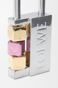 Padlock charm in brass with removable anodised Anagram cube dices engraved with assorted motifs. - Engraved LOEWE, engraved Anagram Colour: Palladium Metallic colour: Gold Main material: Brass Weight: 0.09 kg Width: 8 cm Depth: 4.7 cm Made in: Italy