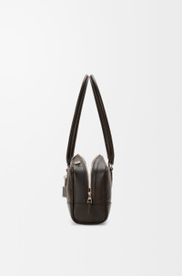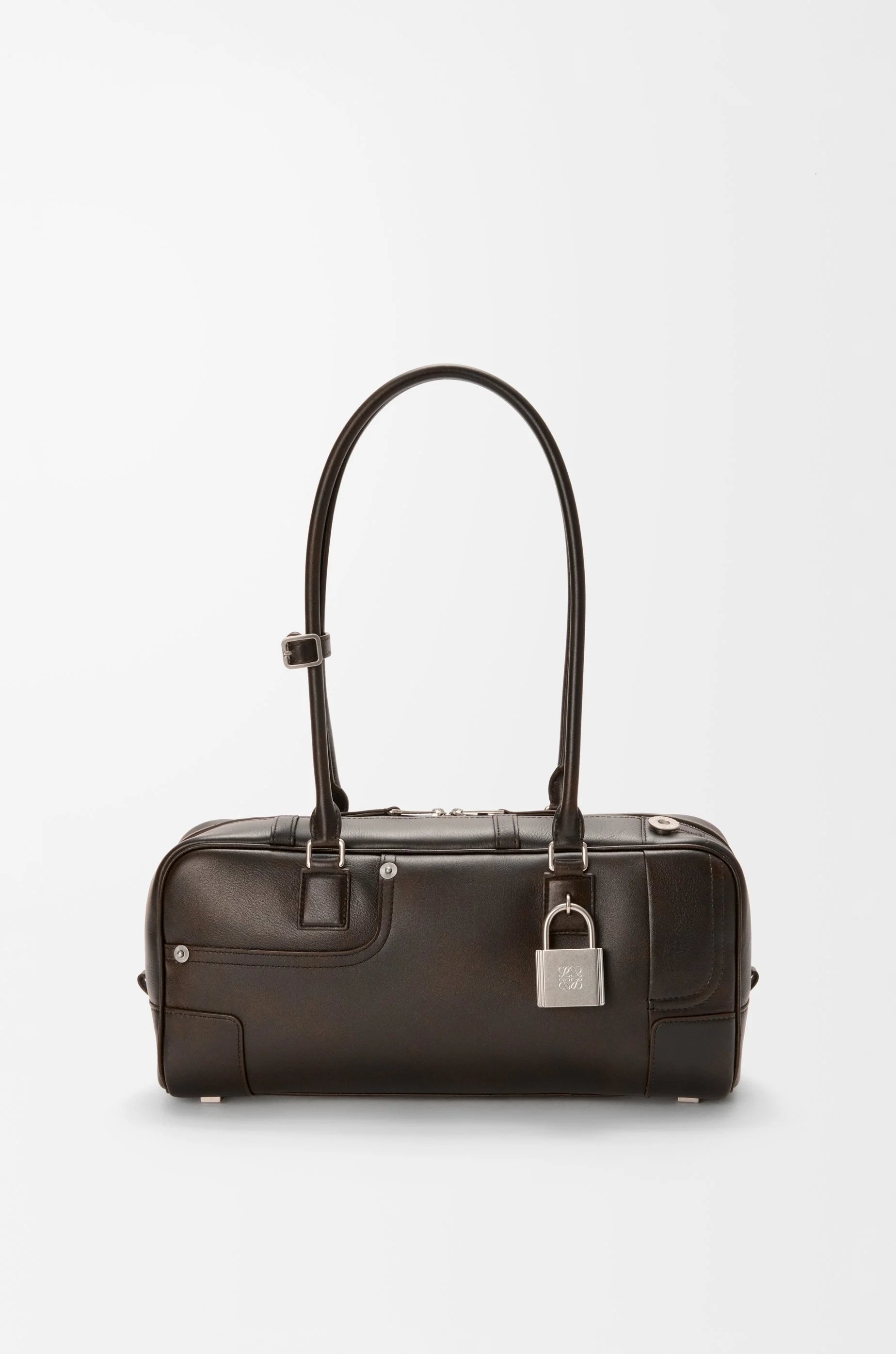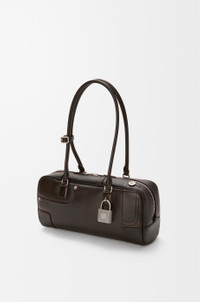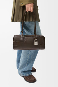 The Amazona displays a classic shape complemented by a signature padlock. This elongated cropped version is crafted in vintage-finish shiny calfskin with denim trousers-inspired details. - Shoulder or hand carry - Articulated handles with handle fastener - Zip closure with calfskin pulls - One slip pocket - Protective metal feet on base - Gold suede lining - Embossed Anagram Colour: Vintage Brown Main material: Shiny calf Handle drop: 25 cm Weight: 0.68 kg Height: 15 cm Width: 30.5 cm Depth: 9 cm Made in: Spain