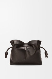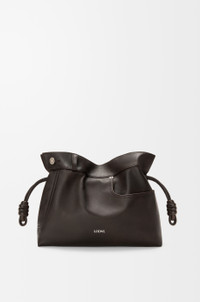 The Flamenco clutch is a soft and slouchy bag with a cinched closure and historical knot drawstrings. This medium version is crafted in shiny calfskin with denim trousers-inspired details. - Shoulder, crossbody or hand carry - Detachable and adjustable strap - Magnetic closure - Herringbone cotton canvas lining - Silver embossed LOEWE Colour: Vintage Brown Metallic colour: Palladium Main material: Shiny calf Strap length: 96 - 120 cm Strap drop: 38 - 44 cm Weight: 0.4615 kg Height: 24.5 cm Width: 30 cm Depth: 10.5 cm Made in: Spain