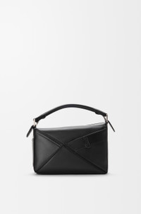 The Puzzle is defined by its distinctive geometric lines and its cuboid form. This small version is crafted in shiny calfskin with denim trousers-inspired details. - Shoulder, crossbody or hand carry - Detachable and adjustable strap - Zip closure with calfskin pull - One external rear pocket, one internal slip pocket - Herringbone cotton canvas lining - Embossed Anagram Colour: Black Metallic colour: Palladium Main material: Shiny calf Strap length: 80.5 - 115.5 cm Strap drop: 40 - 58 cm Handle drop: 7 cm Weight: 0.6 kg Height: 16.5 cm Width: 24 cm Depth: 10.5 cm Made in: Spain