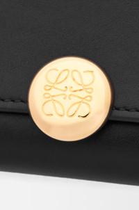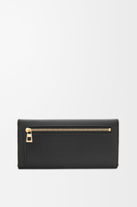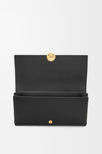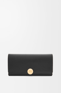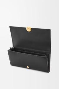 Continental wallet in shiny nappa calfskin featuring a signature Pebble closure. - Zipped back pocket - Zipped coin compartment, ten card slots and two large pockets for notes - Snap button closure with Anagram engraved Pebble - Calfskin lining Details - Colour: Black - Metallic colour: Gold - Main material: Shiny Nappa Calf - Weight: 0.18 kg - Height (cm): 10 - Width (cm): 20 - Depth (cm): 2.5 - Height (inch): 3.9 - Width (inch): 7.9 - Depth (inch): 1 - Model ID: CANBACWX01 - CIL: 0011032521 - Made in: Spain