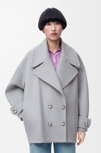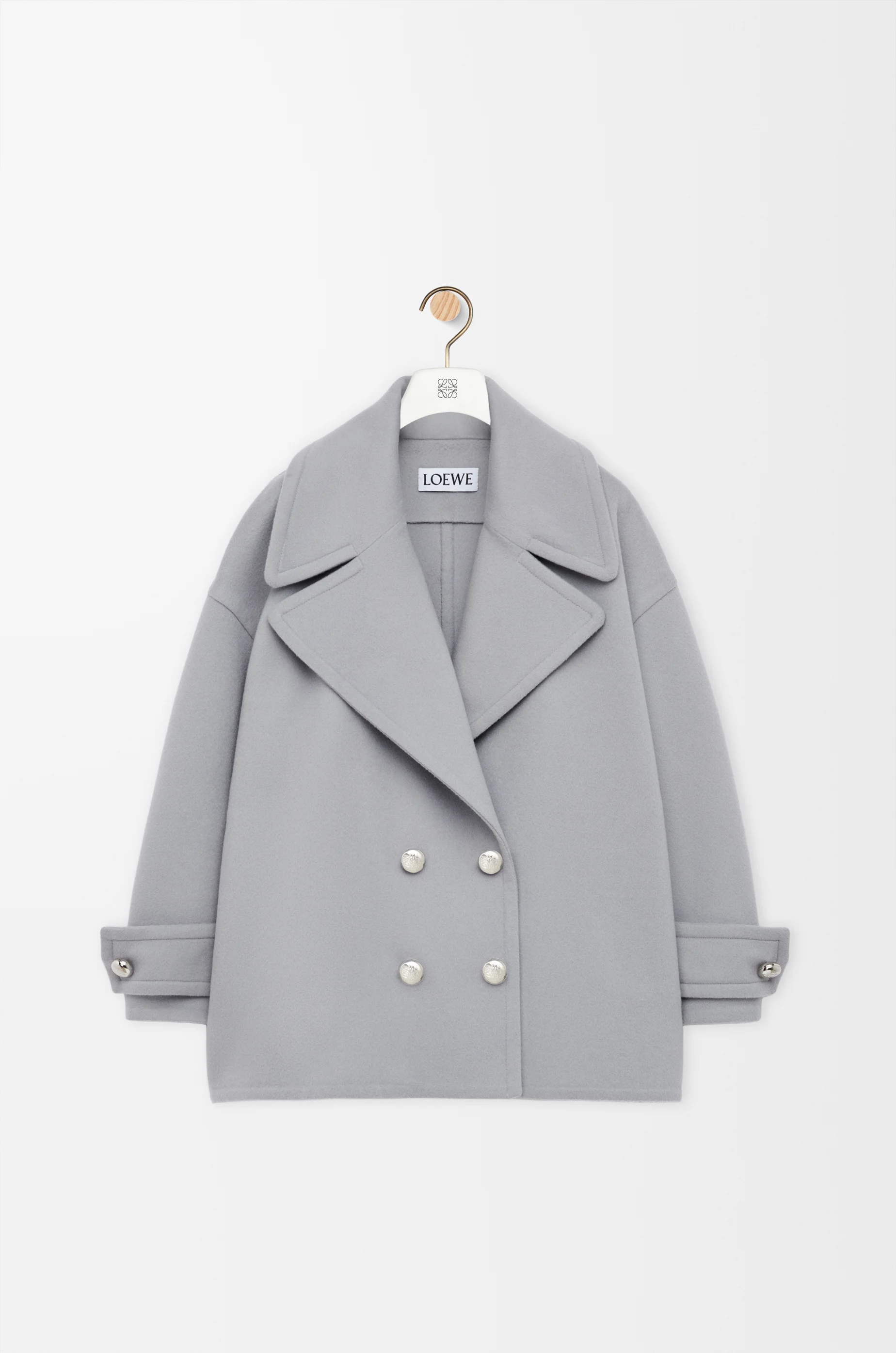 Peacoat in medium-weight double-face wool featuring a double-breasted construction and a cocoon silhouette. - Relaxed fit, short length - Button front fastening with Anagram Pebble buttons - Cuff tabs - Seam pockets - Exaggerated lapels Colour: Grey Main material: Wool Weight: 1.5 kg Made in: Italy Materials & care Main Material: 100% wool Other Material: 100% cotton