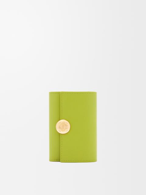 Small vertical wallet in shiny nappa calfskin featuring a signature Pebble closure. - Six card slots - Two small pockets and one larger pocket - Zipped coin compartment - Snap button closure with Anagram engraved Pebble - Calfskin lining - Gold embossed LOEWE Details - Colour: Black - Metallic colour: Gold - Main material: Shiny Nappa Calf - Weight: 0.09 kg - Height (cm): 8.2 - Width (cm): 11.8 - Depth (cm): 3 - Height (inch): 3.2 - Width (inch): 4.6 - Depth (inch): 1.2 - Model ID: CANBS33X01 - CIL: 0011032547 - Made in: Spain