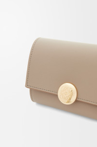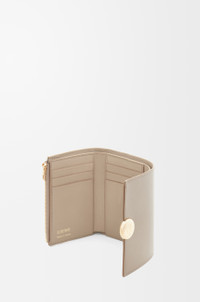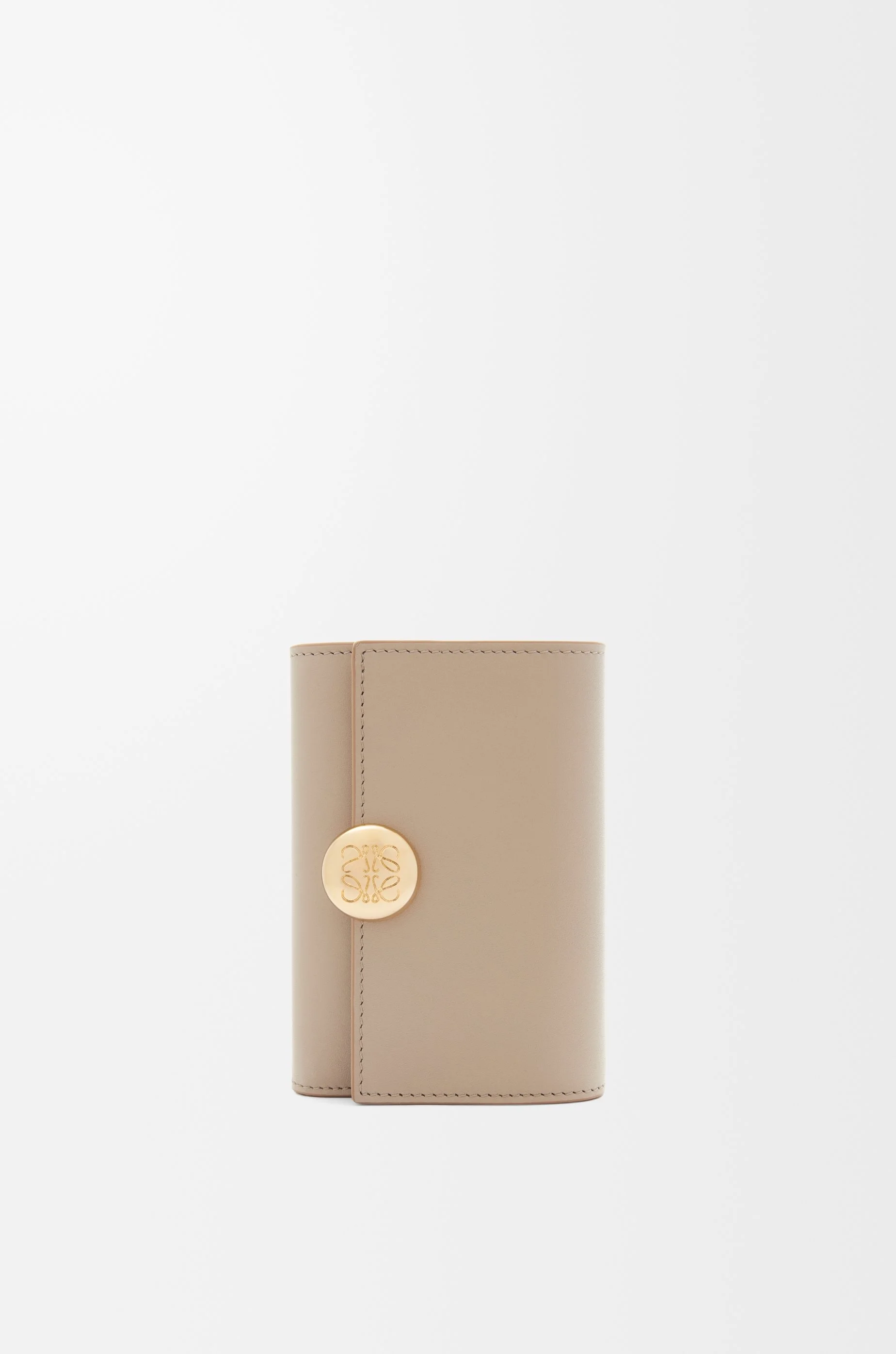 Small vertical wallet in shiny nappa calfskin featuring a signature Pebble closure. - Six card slots - Two small pockets and one larger pocket - Zipped coin compartment - Snap button closure with Anagram engraved Pebble - Calfskin lining - Gold embossed LOEWE Details - Colour: Sand - Metallic colour: Gold - Main material: Shiny Nappa Calf - Weight: 0.09 kg - Height (cm): 8.2 - Width (cm): 11.8 - Depth (cm): 3 - Height (inch): 3.2 - Width (inch): 4.6 - Depth (inch): 1.2 - Model ID: CANBS33X01 - CIL: 0011035458 - Made in: Spain
