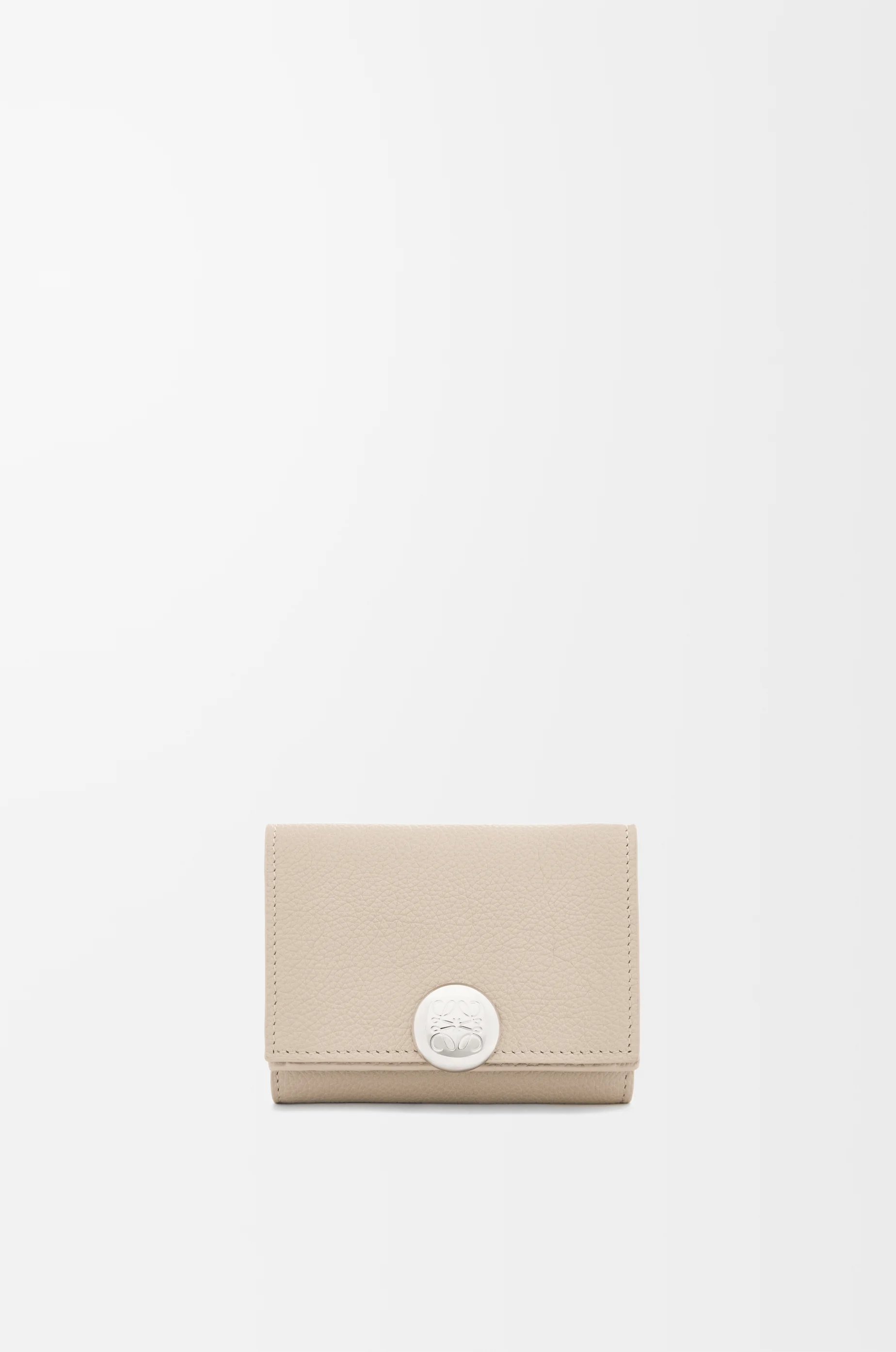 Trifold wallet in pebble grained calfskin featuring a signature Anagram Pebble closure. - Six card slots, three internal pockets - One coin compartment with snap button closure - Snap button closure - Calfskin lining - Embossed Anagram Colour: Light Ghost Metallic colour: Palladium Main material: Mini grain claf Weight: 0.122 kg Height: 7.8 cm Width: 10.2 cm Depth: 3.8 cm Made in: Spain