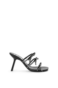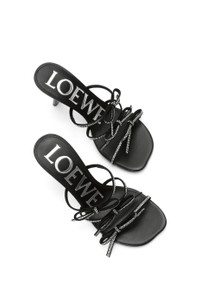 Stiletto sandal in suede with allover rhinestones featuring the signature petal-shaped toe, a glossy lacquered angled heel and a debossed Anagram rubber sole. - 90mm heel - Leather insole Details - Colour : Black - Main material : Suede/Strass - Heel height : 9 - Weight : 0.4 kg - Model ID : LPET465X01 - Made in : Italy